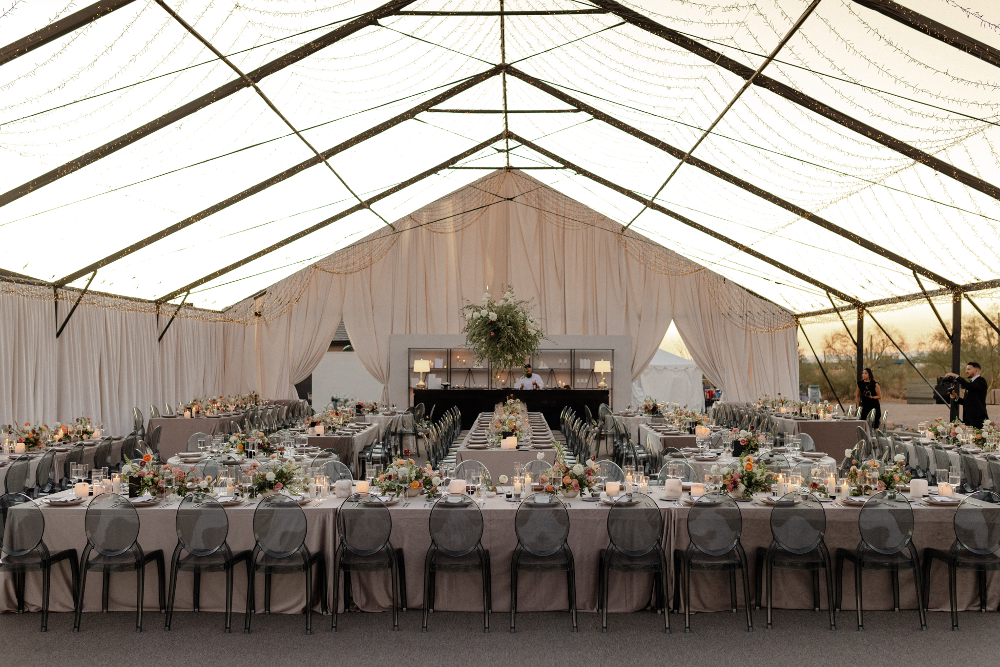 This multi-day destination wedding was held at a private estate in North Scottsdale, Arizona. This transformation started as a driveway and ended as an open-air tented dinner reception amidst the breathtaking Pinnacle Peak mountain range.